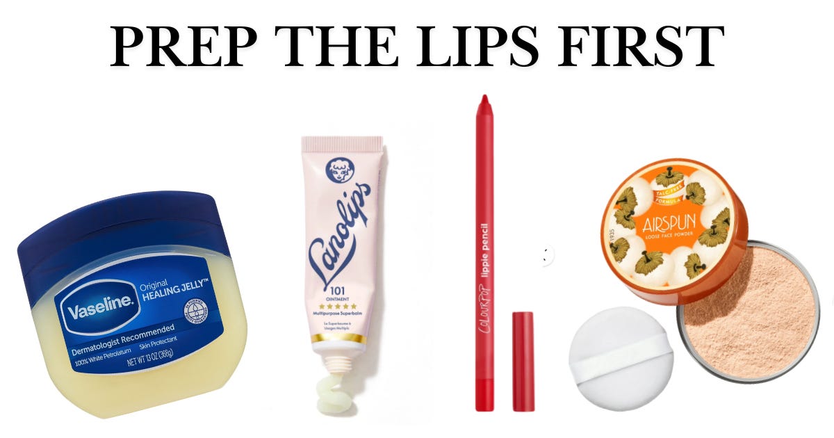For maximum wear, place a tissue over your lips and lightly dust translucent powder on top. Old-school, yes — but incredibly effective. I used to watch my grandmother do this before going out to dinner. She had a loose powder that she used ONLY for setting her Estee Lauder lipstick and that was Coty Airspun.